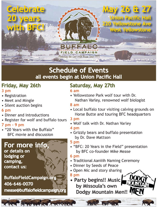 Festivities will include field trips to visit with the buffalo during calving season, wolf-watching, inspiring presentations, music, food, dancing, a silent auction with awesome items, and much more!