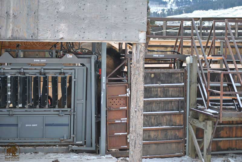 Squeeze Chute (A mama buffalo is forced to endure extreme confinement in the squeeze chute as Yellowstone biologists draw blood, stick their fingers in her mouth to determine age, and lift the chute to weigh her. These are livestock management tactics which have absolutely no place in the lives of wild buffalo)