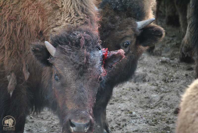 As each buffalo was forced into the squeeze chute, he or she would run forwards, then backwards, then forwards again, bucking, jumping, kicking — doing whatever they thought they could to try and escape the jaws. Often, as Yellowstone's wranglers closed the head-gate to the squeeze chute, their timing would be off and they would clamp down hard on soft bellies or the soft horns of yearling buffalo, breaking them off and inflicting trauma and intense pain. One by one the buffalo were forced to endure these and other horrors, and each buffalo fought with every ounce of strength. The sounds of their banging against cold metal we will not forget. Even worse were the brief moments we were escorted by law enforcement onto the catwalks overlooking a sorting pen. Although they tortured nearly sixty-five buffalo yesterday, they only allowed us to view one pen holding about fifteen yearlings, and it was a bitter and gruesome sight. Bloodied babies that had been separated from their mothers were ramming each other, panting, panicked, and looking at us as if pleading, “Who are you? Where is my mother? Why am i here? Why are you just standing there crying? Let me out!”