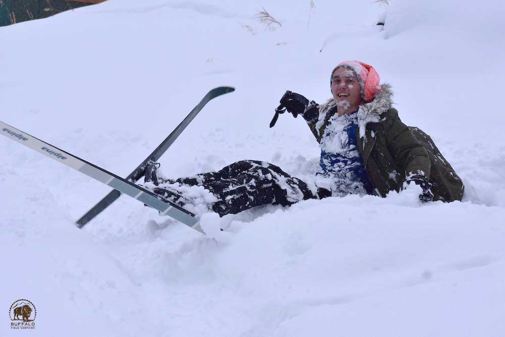 After a well done ski down a steep mountain side, Gage takes a faceplate in the snow. Photo by Stephany Seay, Buffalo Field Campaign.