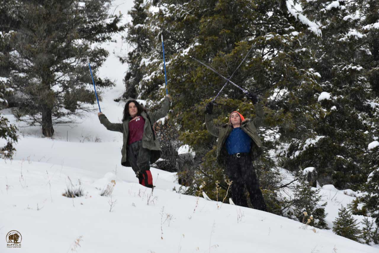 When first arriving to Buffalo Field Campaign you are greeted by a group of friendly coordinators and volunteers that say hello while everyone helps unpack the new volunteer’s luggage and the week’s groceries. The coordinators gave a short tour of the main cabin and discussed the surrounding area of base camp before the new volunteers begin to settle in and formally meet the other volunteers. On my experience, I was greeted by volunteer coordinator Toe and he shared with us the different sleeping arrangements within the main cabin. There is a room disconnected from the commons by a hallway nicknamed the post-office, which was the room I chose to stay in, but the other options consisted of the map room, and Siberia. All the rooms contained lofts that reminds you of forts you would build out of cushions and blankets, but were suitable for a proper night’s rest, which is needed when actively participating in the day to day responsibilities. The kitchen is connected to the commons and communal meals are served that offer a variety of healthy options that cater to anyone’s dietary needs. The bathrooms are well-kept and are accompanied with a clean washer and dryer. Behind the main cabin is the media cabin and the radio cabin. The media cabin is primarily where coordinators can go to focus on camp projects and interactions. The radio cabin is used for keeping in contact with the daily patrols and taking calls. There is internet connection within all these cabins but BFC supports genuine human interactions and follows a no technology rule within the commons area in the main cabin. Anywhere else if free game though, we regularly watched movies within the radio cabin or post office after dinner if we weren’t talking or playing games.