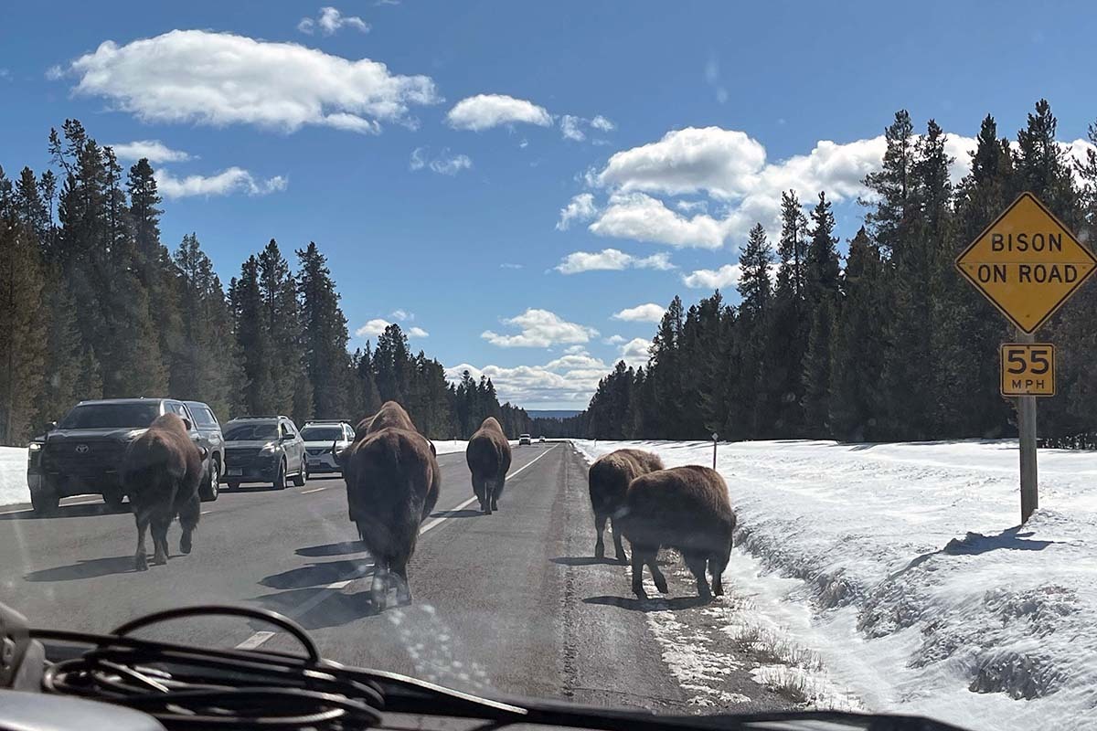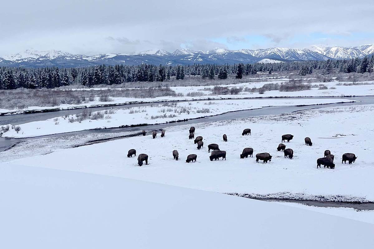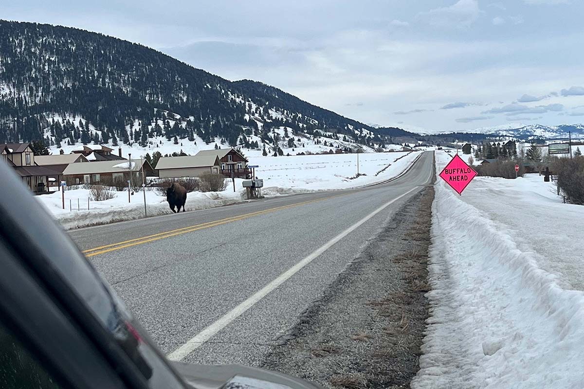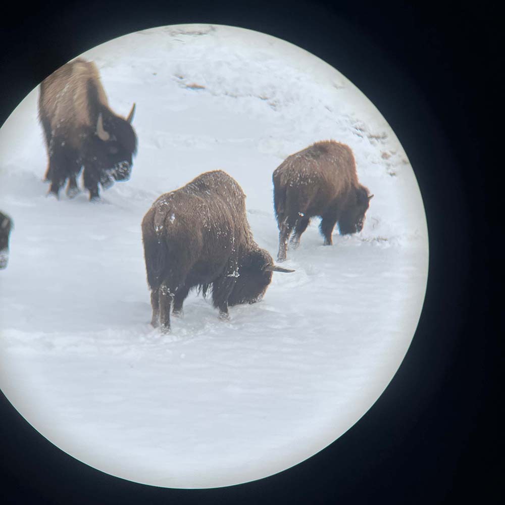 During our daily field patrols we have been tracking family groups predominantly led by matriarchal female bison. Pregnant and showing, they bring their groups of yearlings and 2-3 year old young out of the frozen high country of Yellowstone’s west gate onto the Madison River corridor. When the snow begins to pack under herd determination, it’s the seasoned lead Buffalo Matriarchs that know exactly how to minimize risk ahead as they are leading their families to starve and await the cold teeth of a predator or an annual, dangerous walk to the calving grounds, made dangerous through the Buffalo management plan where the only freedom is the hard won year-round habitat on the Horse Butte Peninsula, the only year-round habitat they enjoy in the State of Montana. It’s in these paths that we find the urban interface between humans; with USFS multi-use roads, highways with the giant semi-trucks that pass without care, and with the tribal members who come to harvest/hunt and who pray to receive them.