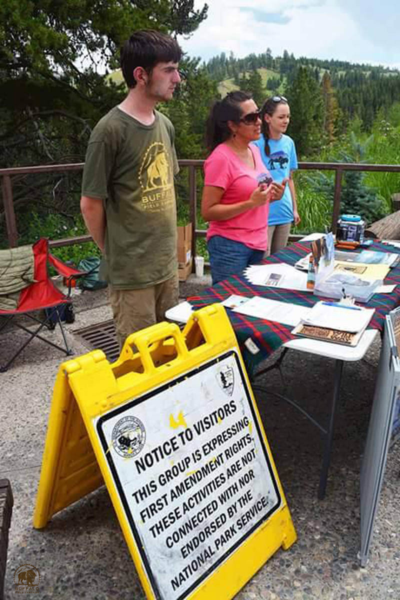 One young environmentalist and journalism student, Daniel M., also known as “Ryker,” shared Native and U.S. historical stories relating to the 40-60 million Buffalo followed and studied by many Native Nations that once roamed together over 1/3 of what is now occupied territory called the United States. In his gentle and quiet tone of voice tourists became engaged in the story of how this majestic relative became reduced by Western U.S. Settlers, U.S. Military Personnel, and poachers to 23 individuals in the Pelican Valley, deep inside Yellowstone. The summer program included research of over 20-years of documents, field science patrols into Lamar and Hayden Valleys for weekly studies of familial behavior (from a Native instructor) and counts as volunteers began to identify the differences between genders, ages, and herds. Ryker continued to share updates with the tourists as 1,100 Buffalo were counted in Lamar, and approximately 900 in Hayden Valley.