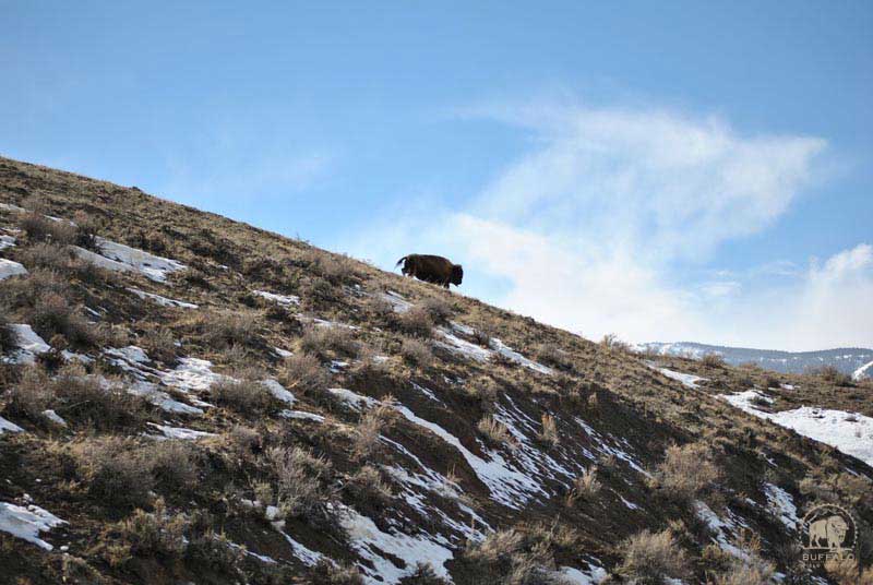 On a recent patrol our volunteers were thrilled when they spotted very fresh grizzly bear tracks! It is always so humbling to come across these massive footprints and know that you share the forests and fields with such a sacred, powerful being. After a long winter’s nap, grizzly bears — federally protected under the Endangered Species Act — are hungry. Two of their most important food sources right now are winter-killed buffalo and elk. Indeed, buffalo meat is becoming increasingly important to grizzly bears due to the impacts that climate change is wreaking on other high-protein foods such as cut throat trout, white bark pine nuts, and army cutworm moths. These latter foods have traditionally been mostly enjoyed by mama bears and their cubs, while the boars tend to eat more ungulate meat. But with the losses of these important foods, moms and cubs are looking for buffalo, too. This is actually increasing grizzly bear deaths, as it brings cubs into more frequent contact with boars, who sometimes kill them. It also brings more bears into contact with hunters during the fall. The solution is simple: allow more buffalo on a larger landscape. Many of the buffalo we are seeing are showing signs of having lived through a difficult winter, and there is one particular adult female, injured and as thin as any buffalo we have seen, on whom we are keeping a very close eye. We are hopeful that she will make it, though her chances are not good. If she doesn't, she will go back into the cycle of life, providing needed nutrients to a hungry grizzly bear.