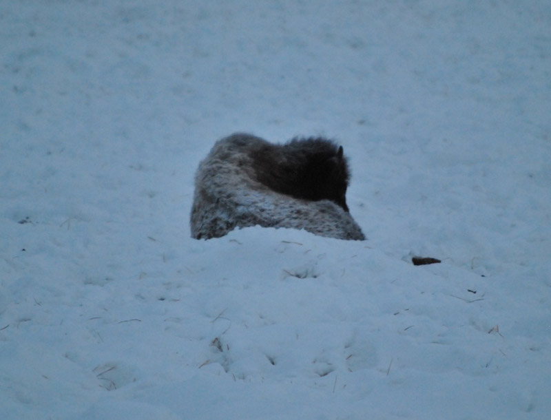 A buffalo calf beds down during a bitter cold morning. Accompanied by a small herd, mom was not obviously near by. Many calves lose their mothers to hunters who like to take the bigger buffalo to fill their freezers, or sometimes their trophy walls. Photo Stephany/BFC