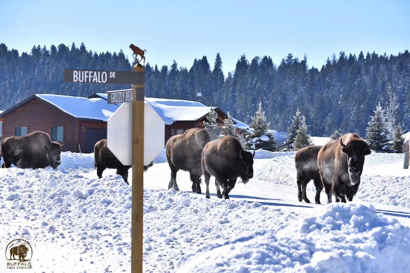 This family group of buffalo made it, unscathed, from Yellowstone’s western boundary into the buffalo-friendly Yellowstone Village/Hebgen Lake Estates. Note the street sign. In celebration, the neighborhood changed all of their street signs after buffalo were granted year-round habitat on Horse Butte. Photo by Stephany Seay, Buffalo Field Campaign.