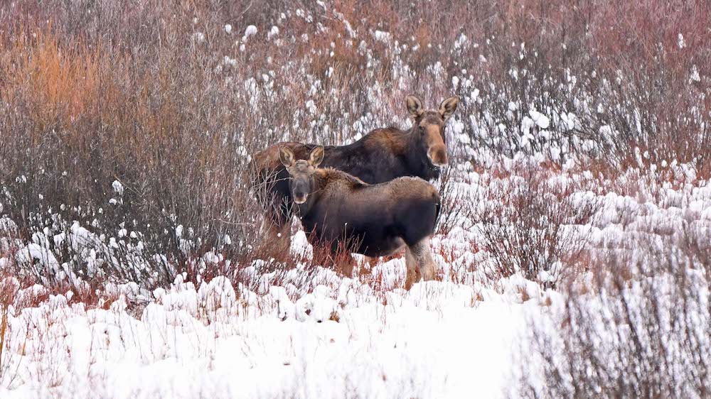 Morning greens for a brisk day: I think it is amazing what opportunities present themselves when you go out of the comfort of a warm home you are familiar with to see something only few get to. Even though I was 2,000 miles from home this mother and calf were home, enjoying a beautiful morning in the snowy Montana landscape.