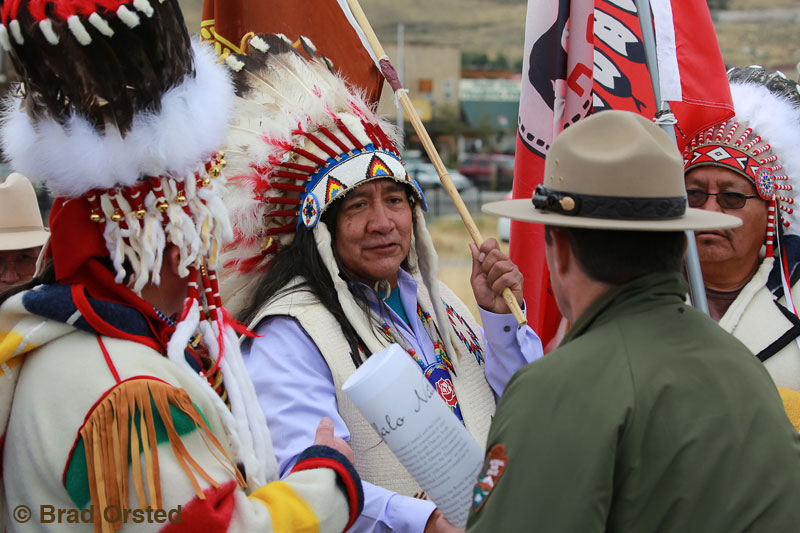 Chief Grier presents Yellowstone Deputy Superintendent Pat Kennedy with the name change declaration. Photo courtesy of Brad Orsted.