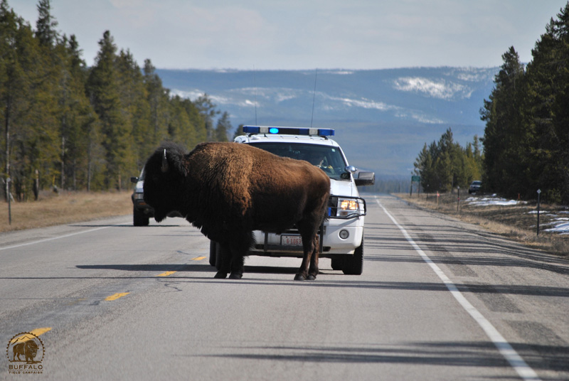 Earlier in the week, Pat and I went to town to run some errands. On the way back, just a few hundred yards from town, we spotted a young bull buffalo who appeared to be making a bee-line for town, which was bustling with visitors to Yellowstone. We were worried for him not only because there were so many people and cars around, but also because he was out of the government’s “tolerance” zone and vulnerable to being harassed or killed. And, while the town of West Yellowstone likes to celebrate the image of the buffalo and make their money off of the people who come to see them, town officials don’t particularly care for the living, breathing version walking down the streets. We pulled to the side of the road with our hazards on to warn traffic as the bull made his way. He stopped at the Gallatin National Forest office to scratch some itches on a pine tree and graze a little of the green grass in their yard, then, after leaving a present, continued on his way. Right then the cops showed up. First a West Yellowstone town police car, then a buffalo-friendly Gallatin County sheriff. They followed the bull, and we followed them. They attempted to escort him in the direction of the park and away from the busy town. But, as BFC’s familiar saying goes: “I’m a Buffalo. I Do What I Want.” While he generally moved where they wanted him to, he made them work hard for it. Without too much trouble, the bull eventually made his way into Yellowstone, and out of their jurisdictions. We felt bad for the buffalo, who was simply walking down the road headed into a town that exits because he and his kind do. All the people there, the visitors, the businesses, heck, even the park itself — they are there because of the buffalo.