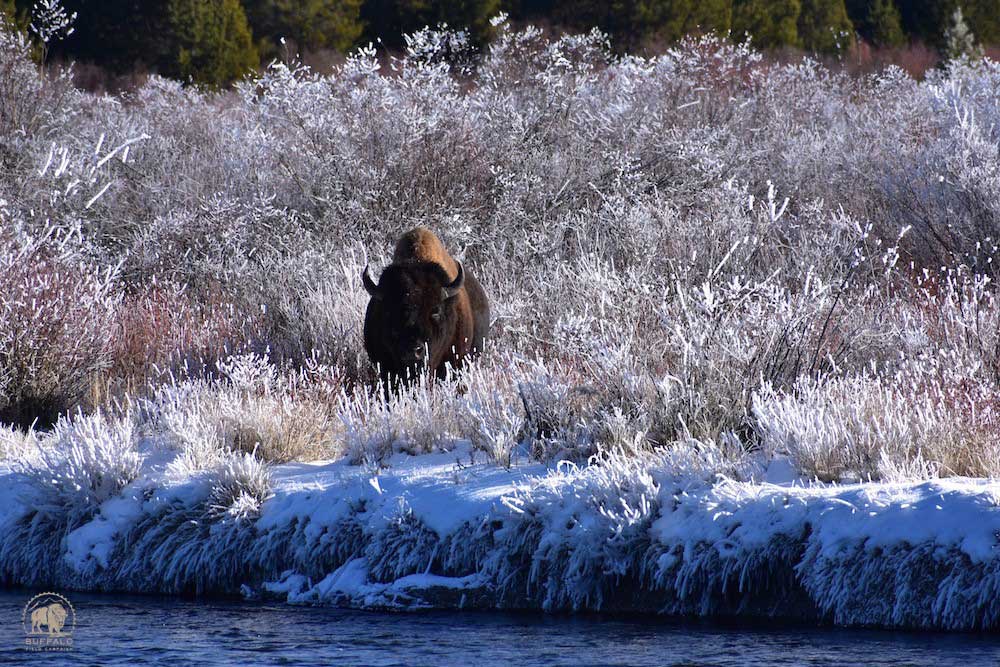 A bull buffalo emerges from the willows along the Madison River, inside Yellowstone National Park. BFC photo by Jaedin Medicine Elk.