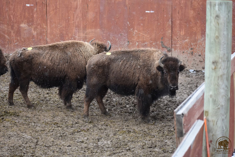 Late-winter and early-spring are the times when some buffalo will not survive the challenges of winter’s tolls. The daytime snow is heavy and wet, and frozen in the dark hours, making it very difficult to crater through to the meager grass offerings below. Most buffalo are sticking to rivers, creeks, and tributaries, to graze sedges along the banks. So many of the adult female buffalo we are encountering are showing that they will soon be ready to give birth. We welcome the end of all this senseless killing, as it starts to give way to the approach of wild buffalo calving season.