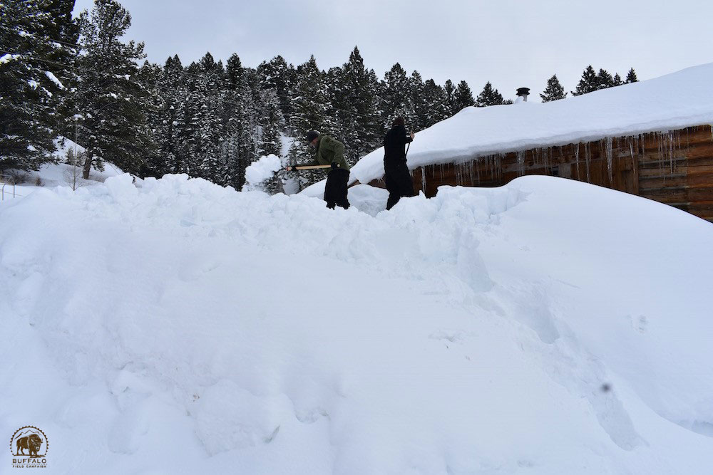During a brief break in the snowstorm, BFC’s Mark and Don climb atop a massive pile of snow, clearing space for more snow to fall. Photo by Stephany Seay, Buffalo Field Campaign.