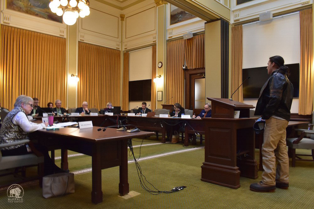 BFC volunteer coordinator, Jaedin Medicine Elk, Northern Cheyenne, speaks out against HB 132 at the Montana Senate Livestock, Agriculture, and Irrigation committee hearing. Photo by Stephany Seay, Buffalo Field Campaign.