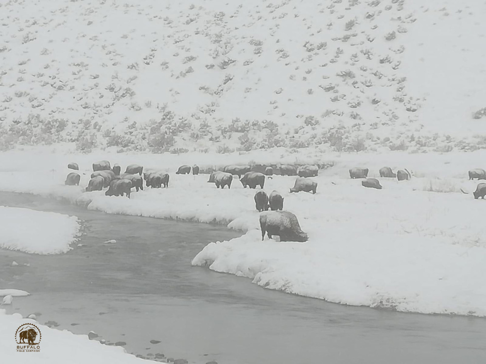 Buffalo graze in a blizzard along the Gardiner River inside Yellowstone National Park. Photo by Georg Bergthaler, Buffalo Field Campaign.