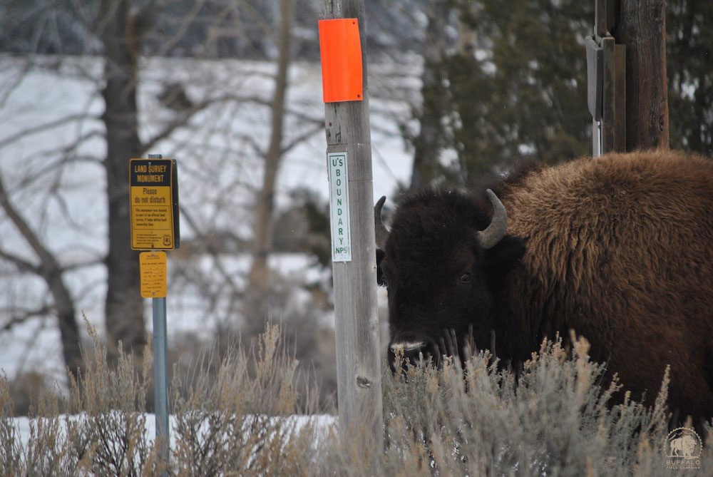 A buffalo approaches Yellowstone’s boundary, entering Beattie Gulch, where hunters await. Photo by Stephany Seay, Buffalo Field Campaign.