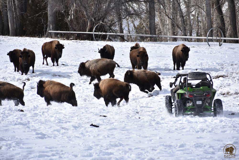 We haven’t had too much to report from the field yet this season, but that has now changed. After months of inactivity due to a relatively mild winter, our last snow event triggered wild buffalo migration, bringing them out of deeper snows in Yellowstone’s higher elevation habitat, to easier grazing in the Gardiner Basin. Our Gardiner camp is now open and in full swing. Gardiner patrols are a full week long, and consist of two to four volunteers doing both morning and afternoon shifts, monitoring the huge expanse of one of North America’s largest wildlife migration corridors. Gardiner is rich with herds of elk, mule deer, bighorn sheep, pronghorn antelope, as well as wolves, coyotes, eagles, and other amazing wildlife. Now, hundreds of wild, migratory buffalo have made their way into the Gardiner Basin, and while we are so thrilled once again to be in their presence after such a long absence, they are being met with all kinds of challenges.