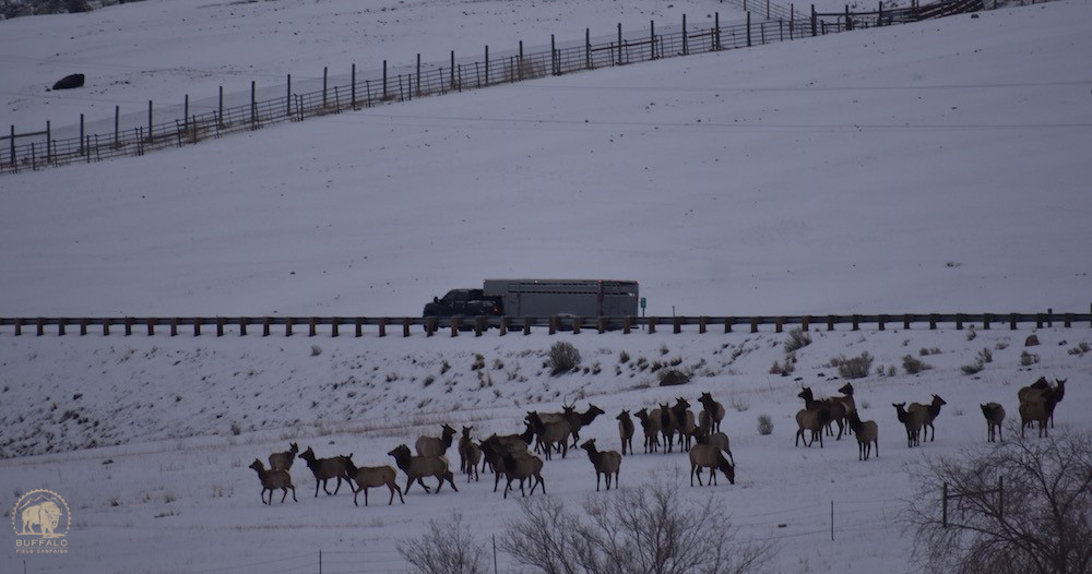 A truck pulls a stock trailer full of wild buffalo captured at Yellowstone’s Stephens Creek buffalo trap. Headed for slaughter, the trailer passes by another capture facility, where buffalo have been taken from Yellowstone and used in science experiments by USDA’s Animal & Health Inspection Service. Along with the bedded down buffalo, also watching the passing vehicle is a herd of elk, implicated nearly 30 times in the transmission of brucellosis to cattle — a crime the buffalo are repeatedly blamed for but have never committed. Elk are rightly free to roam, while the buffalo suffer deep prejudice and gross injustices. Photo by Stephany Seay, Buffalo Field Campaign.