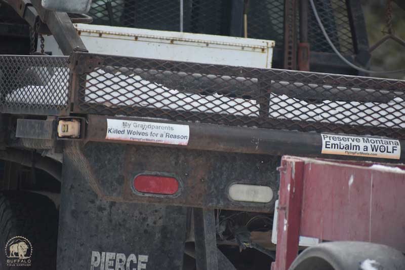 The six kills this week took place after a fair number of buffalo returned to the Hebgen Basin, following the Madison River corridor. Most of the buffalo made it to the safety of the Galanis property, on Horse Butte, moving stealthily during a snowstorm in the dark of night. So long as they are there, they remain safe. But, being a migratory species, buffalo don’t remain in one place for very long. Hunters prowl along the boundary of the Galanis’s land, and drive through the Yellowstone Village/Hebgen Lake Estates subdivision just waiting for buffalo to step over onto the public land of Gallatin National Forest. One small family group of fourteen lost two family members to hunters when they ventured less than twenty yards off of the safe zone. One of these hunters, a local meat processor from Bozeman, was quite the “colorful” character, to put it mildly. Our morning patrol who first encountered him tried to strike up a conversation, and he proceeded to yell and cuss at us and even claimed he had a lawsuit against us. Funny, we’ve never heard anything about it. His attitude and the stickers on his truck (shown above) told us all we needed to know about him. He was the embodiment of this culture that is growing more insane, rude, and blood-lusting every day. It makes it even more heartbreaking that a mother buffalo fell to the gun of such a hateful man.