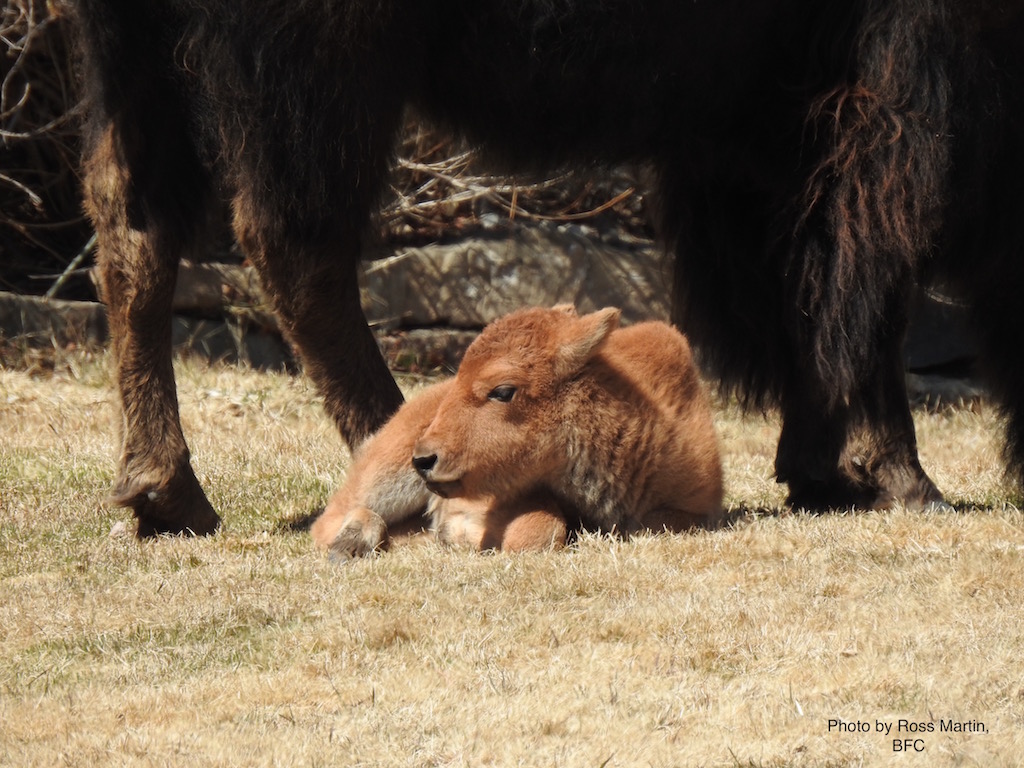 Sunshine pours over the landscape in the Hebgen basin, illuminating the distinctive red color of a buffalo calf. Its mother looks after the calf as it feels the warmth of the spring sun, and she dutifully grooms the young one as it comes awake for the first time. Within hours, the calf is moving around.