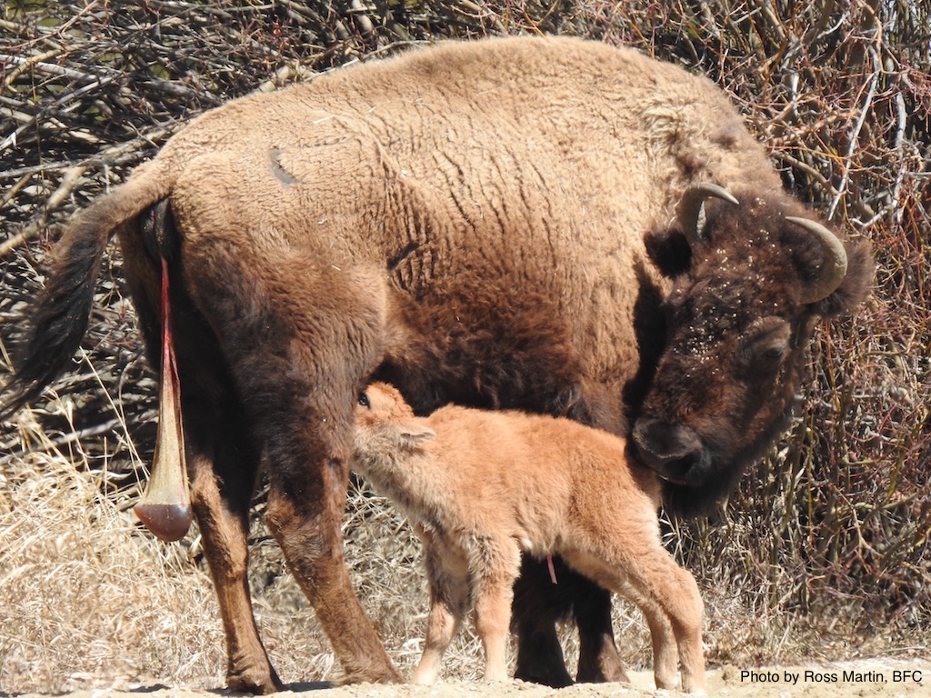 It doesn’t take long to work up an appetite. Still shaky, the calf seeks out milk from its mother. She patiently waits as the little one learns how to nurse below her. Finally, the calf has success, and enthusiastically begins to drink. In the next few months of nursing and grazing on nutritious green shoots this baby buffalo will grow rapidly. It must put on the weight to make it through the winter, so the bulking starts just hours after birth. Buffalo are built to survive.
