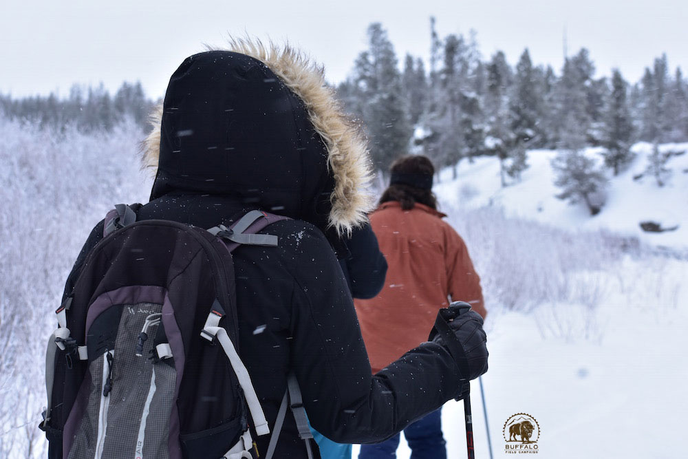 We have, however, had some wonderful wildlife encounters and amazing times on this wondrous winter landscape. Earlier in the week, temperatures plummeted into the negatives, one morning dipping down to -30, but this kind of cold, if you’re dressed right and moving, is really exhilarating to experience. On mornings like that, the willows, trees, and other plants along the creeks and rivers develop a glamorous hoar frost, every branch every stem coated in exquisite ice crystals. It almost feels like you’ve walked through the closet door and stepped into the fantastical realms of Narnia. And although we haven’t seen any buffalo up close and personal, we have had other amazing wildlife encounters with moose, river otters, trumpeter swans, elk, and others, and we have seen the fresh tracks of wolves, coyotes, foxes, ermine, and snowshoe hares. These wild lands never disappoint!