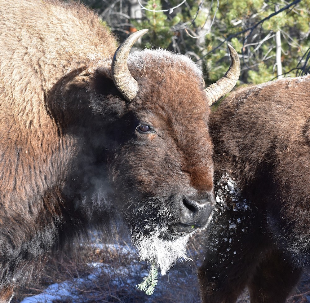 This gorgeous female, decorated with frost and pine needles, was part of the group who headed back into Yellowstone a few days ago. Photo by Stephany Seay, Buffalo Field Campaign.