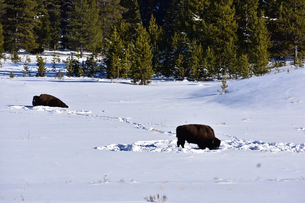 A nice surprise! Two bulls appeared along Highway 191, inside Yellowstone, about 10 miles north of the Hebgen Basin. Buffalo are rarely seen here anymore, but maybe times are changing. If you’re traveling between Bozeman and West Yellowstone, keep your eyes out for these big boys. Photo by Jaedin Medicine Elk, Buffalo Field Campaign.