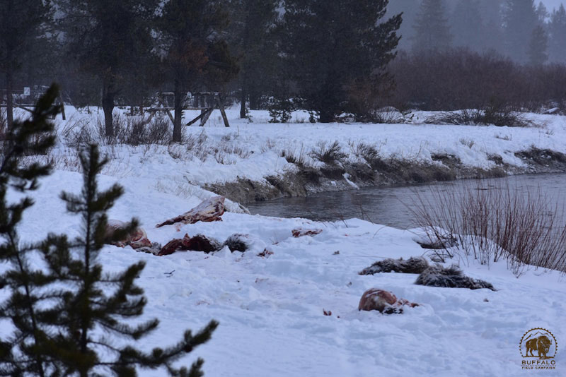 This section of the Madison River flows through the Baker’s Hole campground, national forest land that is adjacent to Yellowstone National Park. Buffalo are supposed to be safe here. It enrages our bruised and battered hearts that this sanctuary was violated. The hunters left a lot of meat and parts of hides. Violating the closure, transgressing and disrespecting tranquil areas where the buffalo should have been SAFE — even with law enforcement there bearing witness, calling for them to not shoot, all they got was a citation. Why shouldn’t that open the door for more hunters to do the same? The law doesn’t seem to have any teeth, and nothing seems to be held sacred anymore. This so-called buffalo hunt is bringing out the worst in some. But, if there is a bright side, more and more people — hunters in particular — are growing disgusted by this war against the buffalo. Very few can stomach participating in such a thing, and many have vowed never to return. Voices for the buffalo and against this traumatic “management" are growing. More voices are speaking out against the entirety of the Interagency Bison Management Plan, and its many ugly faces of capture-for-slaughter and firing-line “hunting.” There is growing solidarity for more wild buffalo on a larger landscape.