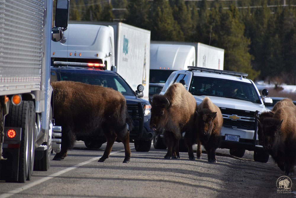 US Highway 191 poses one of the biggest threats to wild buffalo. When motorists are patient, the buffalo will move along and get off the highway, but, when humans — i.e. law enforcement — feel they need to take action, they only exacerbate the situation. In a testosterone-filled display of patriarchy, these buffalo - many pregnant females - were hounded by lights, sirens, and cracker rounds of four different law enforcement entities. Photo by Stephany Seay, Buffalo Field Campaign.