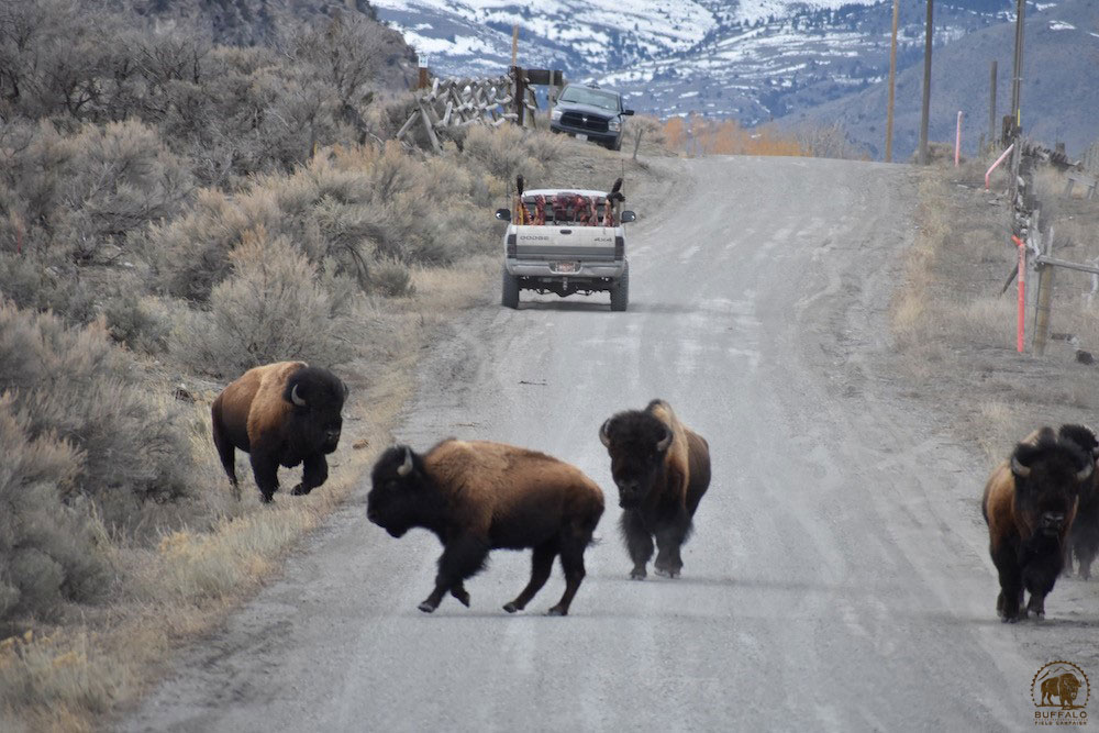 Beattie Gulch area, just outside Yellowstone’s northern boundary. Bulls flee towards the park after being passed by a hunter who’s truck was loaded with buffalo parts. Photo by Stephany Seay, Buffalo Field Campaign.