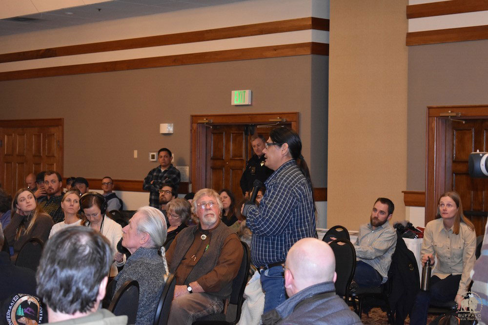 The public comment period was full of powerful, logical, and impassioned pro-buffalo comments. BFC’s executive director, James Holt, member of the Nez Perce tribe, eloquently spoke to how tribes’ treaty rights are being manipulated by the agencies for this management scheme, and how the whole thing is a disrespectful disgrace for our national mammal. BFC’s co-founder Mike Mease addressed the glaring hypocrisy in how elk — who have been blamed numerous times for spreading brucellosis — are allowed to roam freely, while buffalo who have never transmitted the cattle-disease are treated as vermin.