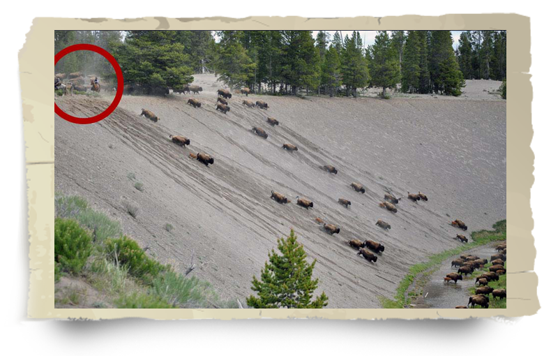 “Government agents (circled) use your tax dollars to haze buffalo down steep, loose incline. How many babies can you count?”